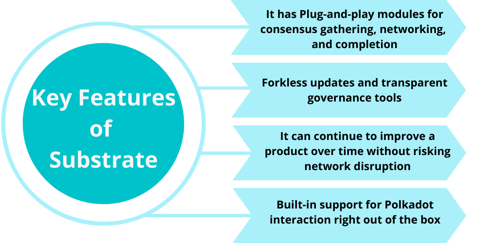 Being a complete blockchain building platform, Substrate provides all the building blocks of a blockchain, such as a database layer, network layer, consensus engine, transaction queue, and runtime module library.